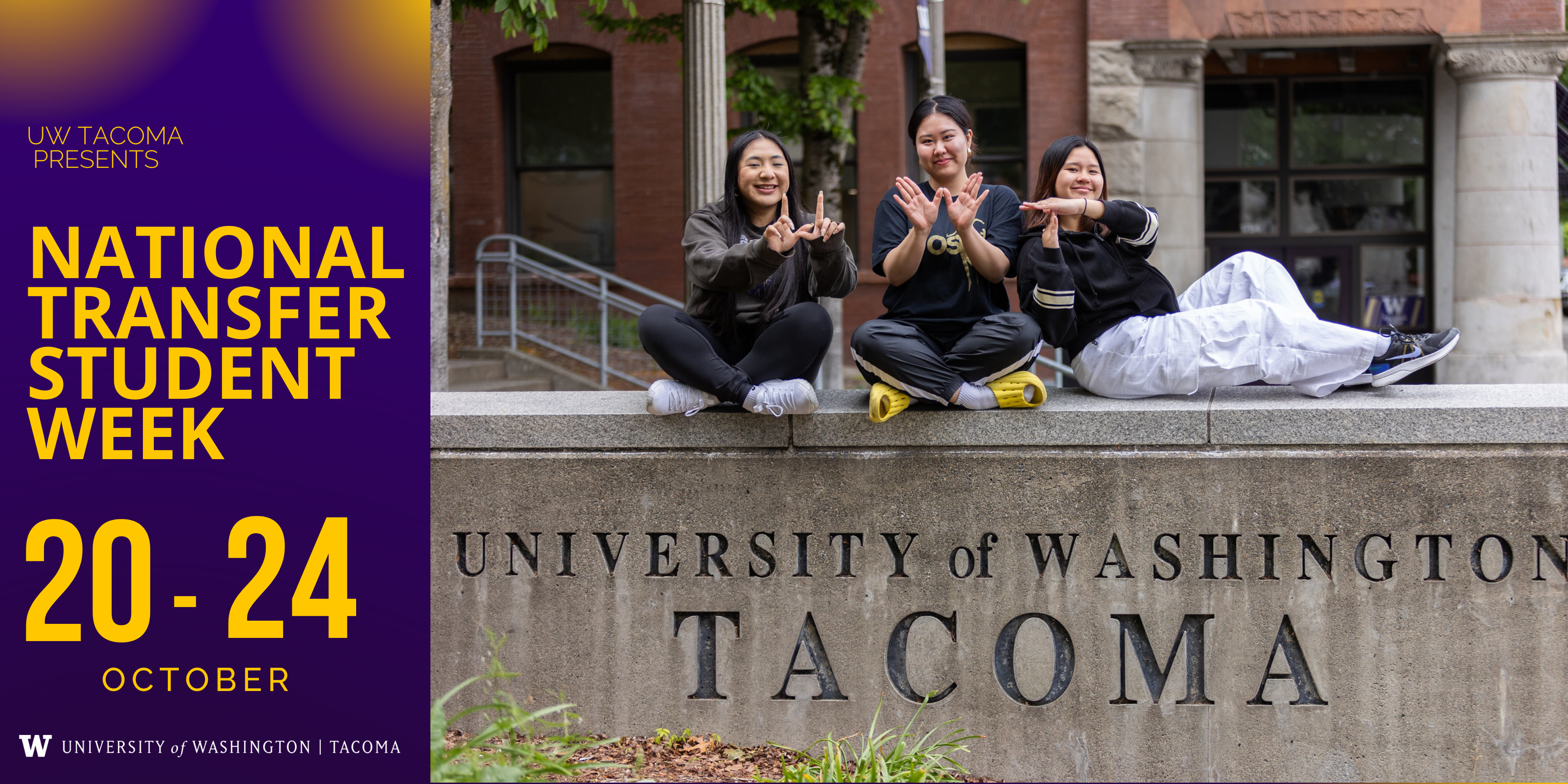 Join us for National Transfer Student Week!![]() National Transfer Student Week is a weeklong series of events at UW Tacoma, dedicated to supporting and celebrating transfer students. Join us for virtual and in-person events that cover majors, student life, the application process and much more! |